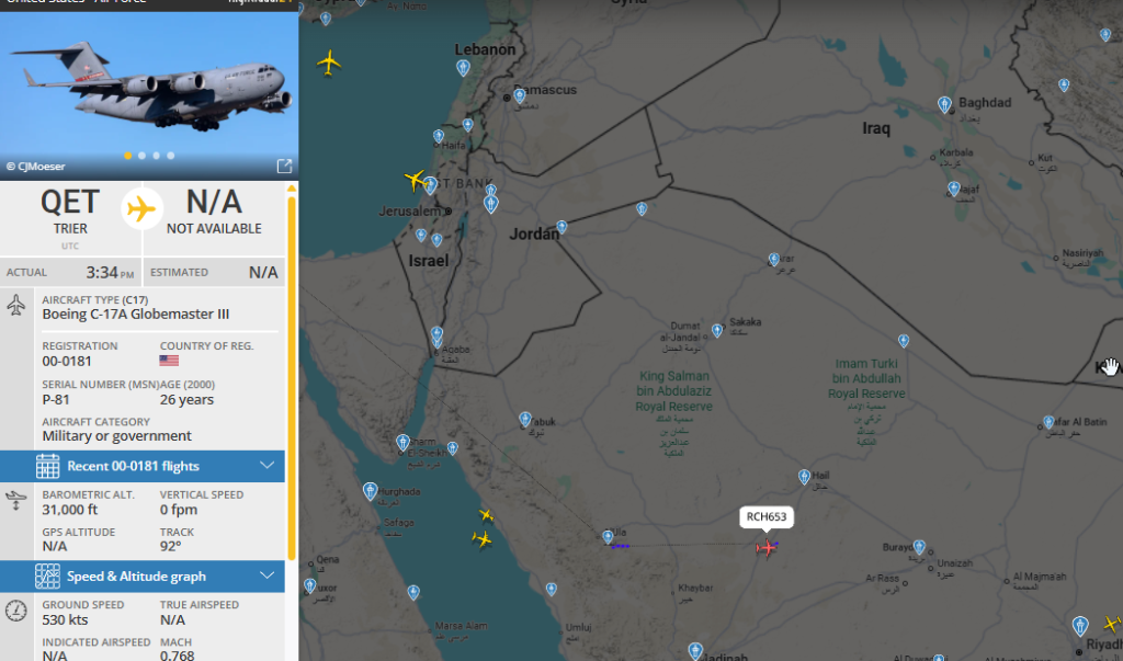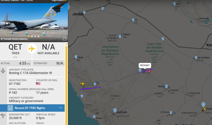 بجانب نشاط المراقبة والتجسس والاستطلاع الذي قامت بها الطائرات الأمريكية انطلاقا من قاعدة الأمير سلطان بالسعودية، رصدنا 8 طائرات أمريكية مخصصة للشحن العسكري الثقيل بالمجال الجوي السعودي منذ بدء الهجوم على إيران.