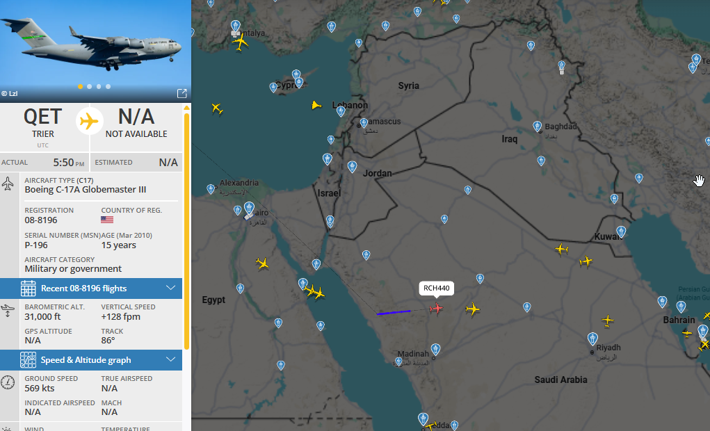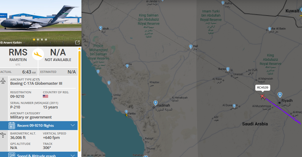 في الثاني من مارس، مرت بالمجال الجوي السعودي طائرة شحن عسكري أمريكية من طراز Boeing C-17A Globemaster III، حملت رقم تسجيل 000181، قدمت من قاعدة Spangdahlem وعبرت المجال الجوي السعودي نحو الإمارات.
