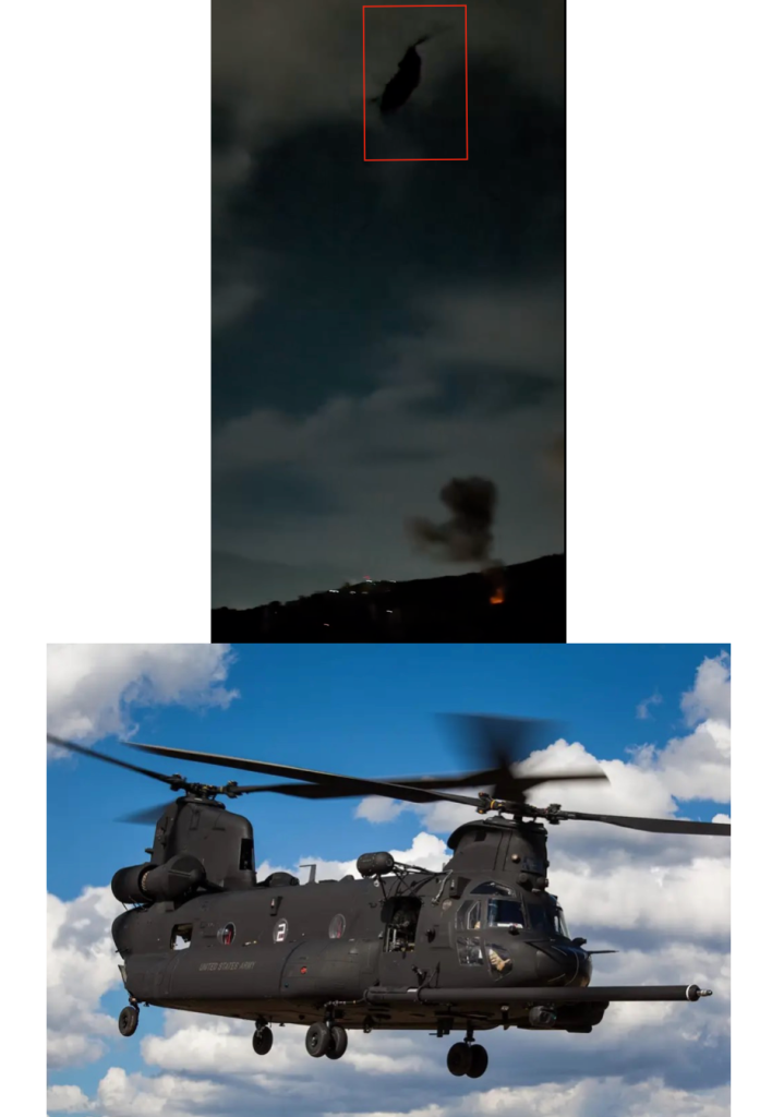 ظهر في نفس المقطع المصور أيضا طائرة مروحية شاركت في الهجوم نرجح أنها من طراز MH-47G Chinook، وهو نفس النوع الذي يمتلكه “الفوج 160 طيران عمليات الخاصة” التابع للجيش الأمريكي 160th Special Operations Aviation Regiment وهو أحد الوحدات المركزية التي شاركت في العملية العسكرية في فنزويلا.