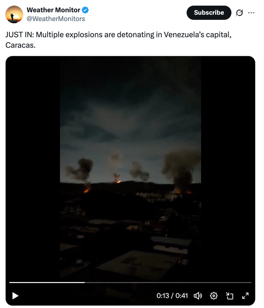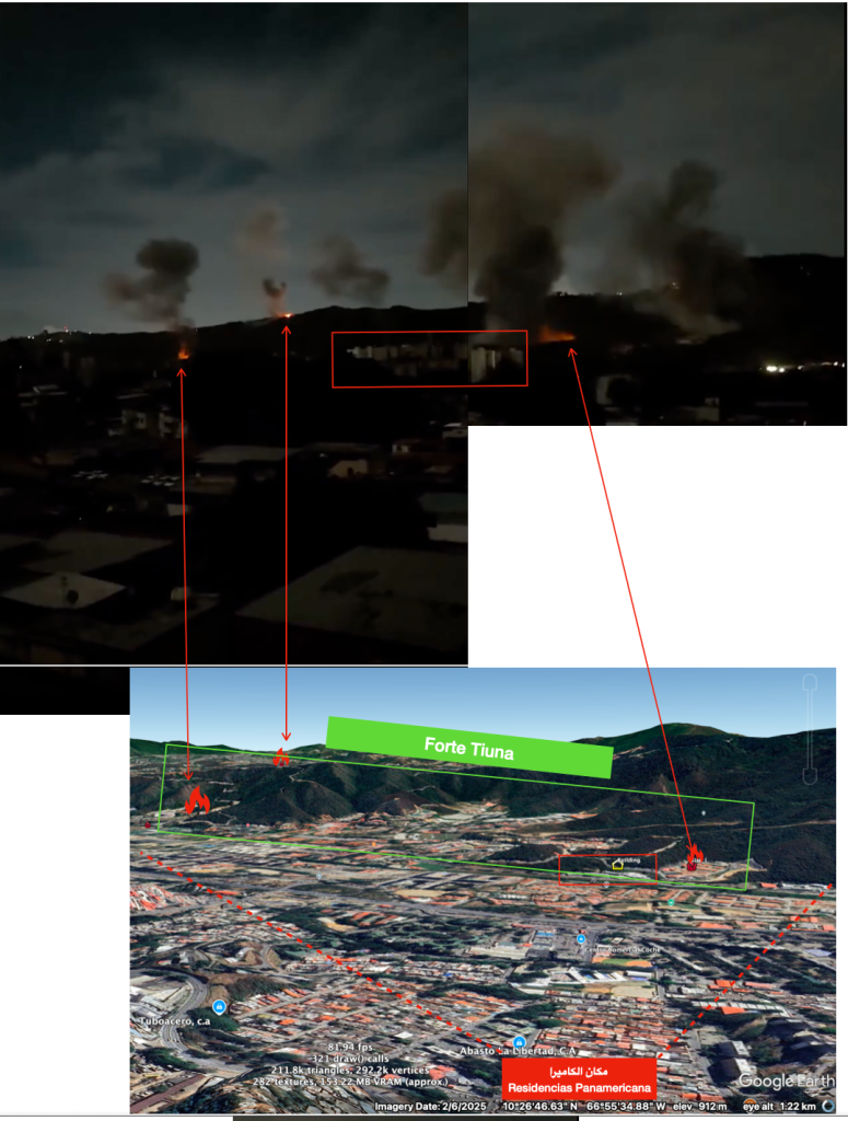 ثم، كان الحدث الأبرز في قلب العاصمة؛ حين شنّت المقاتلات الأميركية غارات استهدفت ميناء كراكاس ومطارها الخاص، كما طالت الضربات الجوية مجمع “فورت توينا” العسكري، وتزامن ذلك مع انقطاعٍ كامل للتيار الكهربائي عن العاصمة، و تحليق مروحيات أمريكية على ارتفاع منخفض. فيما أعلنت كراكاس حالة الطوارئ القصوى والتعبئة العامة، ووصفت ما جرى بأنه “عدوان إمبريالي خطير” يهدف إلى الاستيلاء على ثروات البلاد النفطية، وتعهدت بالرد.