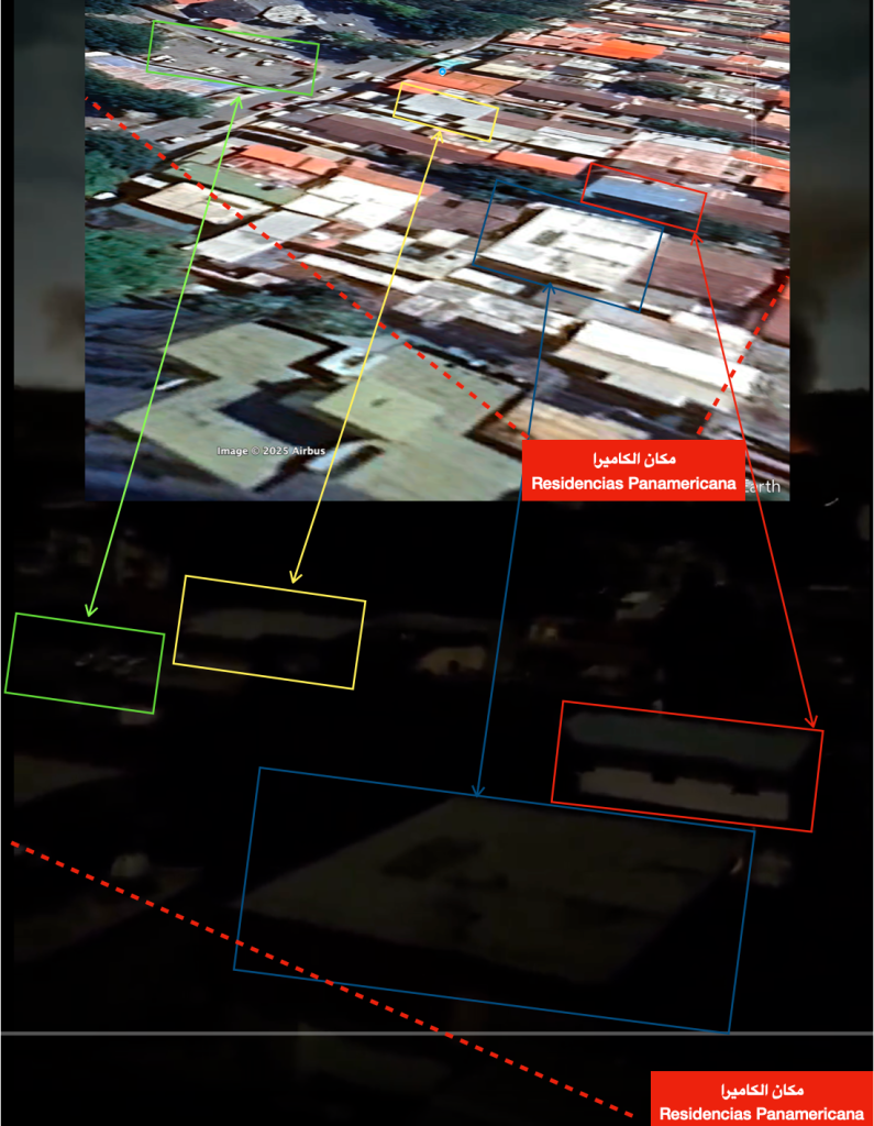 ومن خلال تحليل المقطع المصوّر، أمكننا تقدير الموقع التقريبي لالتقاطه عبر تمييز عدد من المباني القريبة من المكان الذي تواجد فيه مصوّر الفيديو، إضافةً إلى موقف سيارات مجاور ظهرا بوضوح ضمن المشاهد؛ وبناءً على ذلك، نرجح أن مصور الفيديو كان متواجدًا في إحدى الشقق التابعة للمجمّع السكني المعروف باسم Residencias Panamericana والمطلة على التلة.