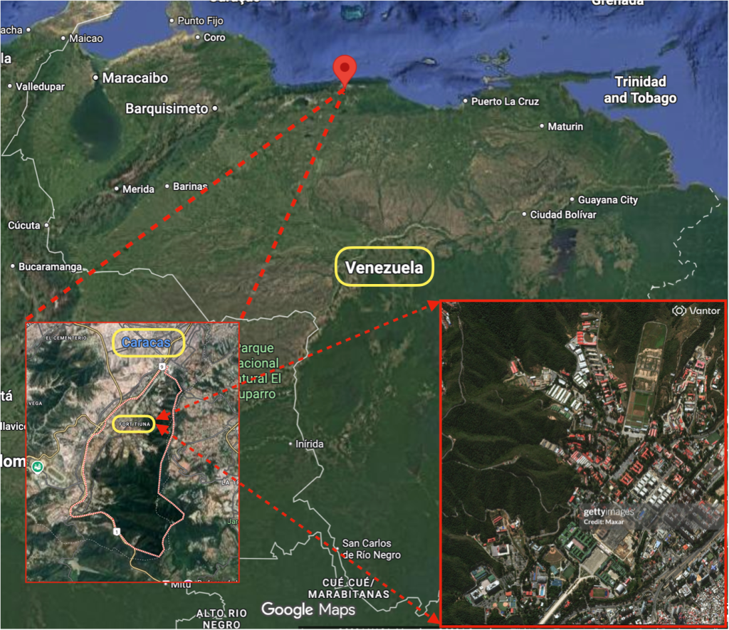 يقع المجمّع العسكري فويرتي تيونا -Fuerte Tiuna جنوب غرب العاصمة بين منطقتي “كوتشي – Coche” و”إل فايي – El Valle” ويعد أكبر وأبرز مجمّع عسكري في كاراكاس ومن أهم مراكز الثقل العسكري والسياسي في دولة فنزويلا؛ إذ يضم مقر مؤسسات عسكرية محورية مثل: وزارة الدفاع، وهيئة الأركان العامة للقوات المسلحة والدائرة العسكرية في كاراكاس، والأكاديمية العسكرية إلى جانب مرافق وتشكيلات أخرى تشمل ميادين تدريب ورمي، ومجمعات سكنية خاصة بالضباط وموظفي الهيئات الحكومية بالإضافة إلى منشآت خدمية وعسكرية أخرى.