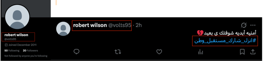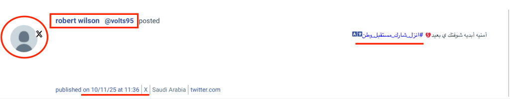 باستخدام أداة التحليل Talkwalker، تمكّنا من تحديد الحساب الذي أطلق الوسم لأول مرة، وهو حساب يحمل اسم robert wilson (@volts95)، ومسجّل بموقع جغرافي في المملكة العربية السعودية.