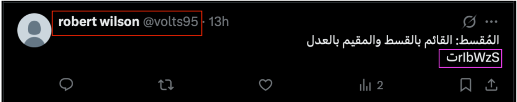 أما المنشور الثاني الذي نشره الحساب @volts95، فقد تضمن نصًا ينتهي بإضافة عشوائية — وهي طريقة شائعة الاستخدام بين منسّقي الحملات الإلكترونية الوهمية، تهدف إلى خداع خوارزميات منصات التواصل الاجتماعي عبر إظهار المنشورات وكأنها غير مكررة، لتفادي تصنيفها كمحتوى آلي أو مكرر.