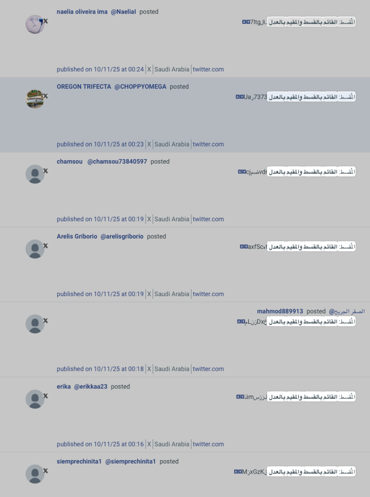 بالبحث عن نص المنشور نفسه: “المقسط: القائم بالقسط والمقيم بالعدل” تبيّن وجود عشرات الحسابات التي أعادت نشر النص ذاته مع اختلاف بسيط في الإضافة العشوائية بنهاية المنشور، ما يؤكد أن هذه الحسابات تدار بطريقة آلية ومنسقة ضمن شبكة واحدة.