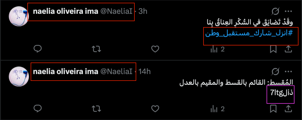 ومن خلال تحليل أحد الحسابات المرتبطة بتلك الشبكة — وهو حساب naelia oliveira ima (@NaeliaI) — تبيّن أنه يحتوي على منشورين فقط: