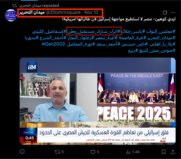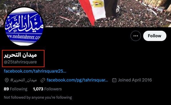 وفقًا لبيانات أداة Talkwalker، يتصدر حساب ميدان التحرير (@25tahrirsquare) – وهو حساب يدير صفحة إخبارية مصرية تضم نحو 1,073 متابعًا – قائمة الحسابات الأكثر تأثيرًا في نشر الوسم محل التحقيق، بعد أن نشر تسعة منشورات مرتبطة به.