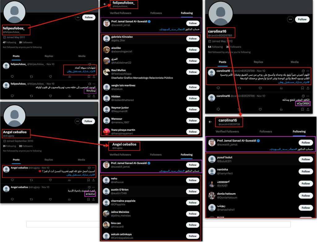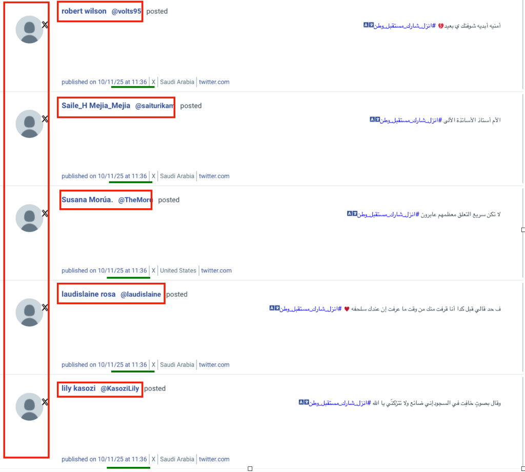 اللافت أن معظم هذه الحسابات كانت مسجّلة كمستخدمين سعوديين، لكنها لا تحمل أسماء عربية، وتفتقر إلى صور شخصية أو محتوى أصلي، وهو نمط يتكرر عادة في الحملات الإلكترونية المنسقة.