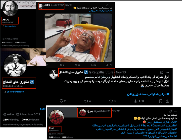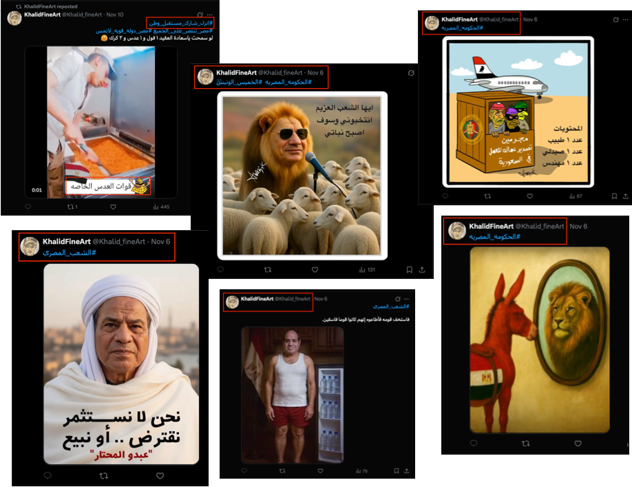 ويكشف هذا النمط عن توظيف ساخر للوسوم المصرية الرائجة من قبل الحساب، بما يُبرز ازدواجية واضحة في طبيعة المشاركين في الوسم محل التحقيق — بين شبكة حسابات وهمية مؤتمتة تُدار لأهداف سياسية، وهي التي أطلقت الوسم ودفعت به إلى صدارة التريند، وحسابات أخرى استغلت الترند المصري لأغراض السخرية والتفاعل العبثي.