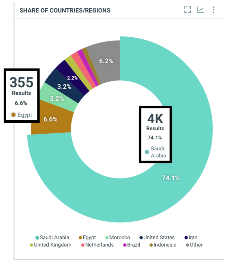 ومن خلال التحليل الجغرافي لبيانات الوسم عبر Talkwalker، تبيّن أن 74% من إجمالي المنشورات (نحو 3,980 من أصل 5,370) انطلقت من المملكة العربية السعودية، بينما لم تتجاوز حصة مصر – مسرح العملية الانتخابية – نسبة 6.6% فقط.