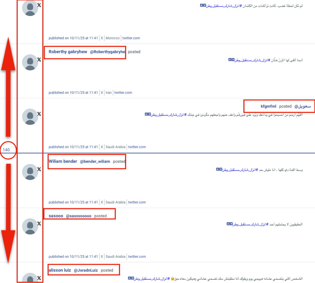 زمنيًا، أظهرت البيانات أن الحملة بلغت ذروتها خلال أقل من ساعة واحدة من إطلاق الوسم، حيث تركزت غالبية المنشورات في دفعة واحدة متزامنة، أعقبها انخفاض حاد ومفاجئ في معدل النشر — وهو نمط تقني معروف للحملات المؤتمتة التي تعتمد على تشغيل برمجي مركزي ثم توقف مفاجئ بعد انتهاء المهمة.