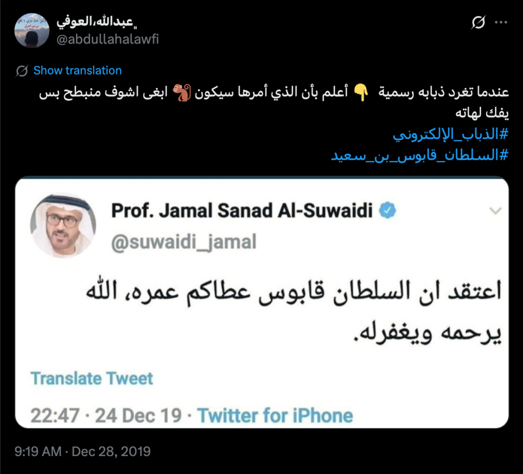 وفي سياق سابق عام 2019، ورد اسم السويدي في تقارير إعلامية وتحقيقات رقمية تحدثت عن تورطه المزعوم في حملة إلكترونية نظّمتها جهات إماراتية عبر لجان إلكترونية، استهدفت نشر شائعات حول وفاة السلطان قابوس، بهدف تضليل الرأي العام العُمانيآنذاك.